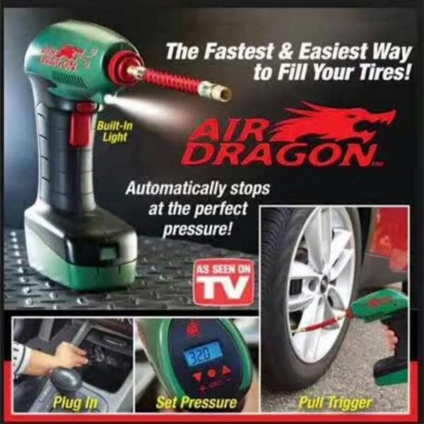 • Air Dragon is your own personal, portable pressure pump! This super-handy, hand-held air compressor is powered from the 12v outlet in your car so it’s always ready to go!